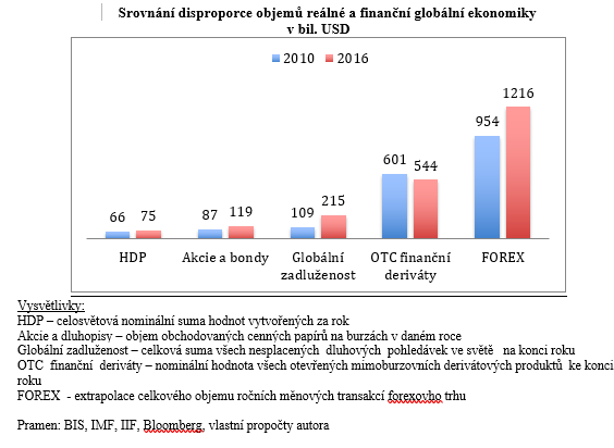 Proto se stále víc kapitálu přesouvá z reálné ekonomiky do virtuální finanční sféry spekulativních obchodů na světových finančních trzích, kde postupně získávají dominantní pozici. Vývoj v posledních letech a současný stav financializace svědčí o nadměrné expanzi peněz v globální ekonomice zejména při srovnání objemů globálního HDP, úvěrové expanse a velikosti jednotlivých finančních trhů.