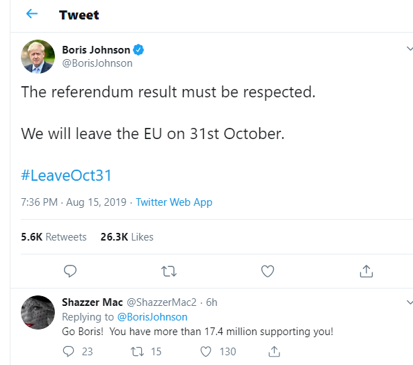 A co na to sám Johnson? S reakcí se vytasil na svém twitterovém profilu, kde ráno 15. srpna stručně oznámil: „Výsledek referenda musí být respektován. EU opustíme 31. října.“
