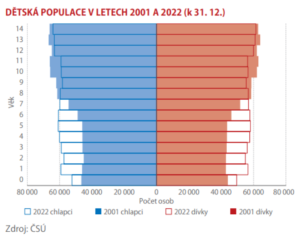 Předběžné výsledky za rok 2022 bez započítání uprchlíků z Ukrajiny totiž napovídaly, že počet dětí ve věku 0–14 let by se v roce 2022 již dále nezvyšoval, ale naopak by klesl. V pozadí potenciálního zastavení rostoucího trendu počtu dětí stál výrazný rozdíl v síle generací na hranici věkového intervalu dětské složky. Během roku 2022 opustily skupinu 0–14letých děti narozené v roce 2007, kterých bylo na počátku roku 115,7 tisíce, zatímco nově do populace vstoupilo jen zhruba 100 tisíc dětí narozených roku 2022. Celkový nárůst dětské složky populace o 57,4 tisíce v roce 2022 tak nastal v důsledku kladného salda zahraniční migrace, které ve věkové skupině 0–14 let dosáhlo úrovně 75,9 tisíce osob.