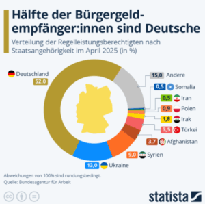 Podle nejnovějších údajů Spolkového úřadu práce byla v dubnu 2025 více než polovina z přibližně 5,4 milionu příjemců občanského příspěvku Němci. Druhý největší podíl tvoří Ukrajinci (13 %), následují Syřané (9 %) a Afghánci (3,7 %), jak uvedl web Statista.