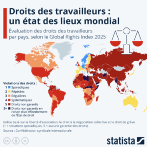 Podle nejnovější studie Mezinárodní odborové konfederace (ITUC) je v roce 2025 deset nejméně příznivých zemí pro pracovníky Bangladéš, Bělorusko, Ekvádor, Egypt, Svazijsko, Myanmar, Nigérie, Filipíny, Tunisko a Turecko.