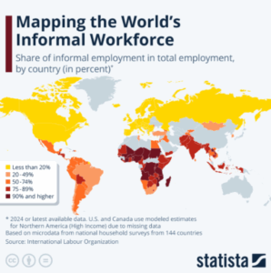 Jak je patrné z infografiky, neformální zaměstnání je nejrozšířenější na globálním Jihu, kde několik zemí v západní a střední Africe zaznamenalo více než 90 % neformálního zaměstnání.