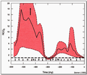 Graf č. 1 – Vývoj koncentrací CO2 na Zemi. Zdroj: (Kalenda 2016) s odkazem na Berner 1990.